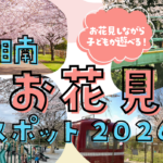 豊かな自然と楽しい遊具がいっぱいの『新林公園』。3月末から4月にかけては、満開の桜が楽しめます。「冒険広場」遊具の近くに桜の木があるので、遊ばせながらお花見ができるのも魅力です。